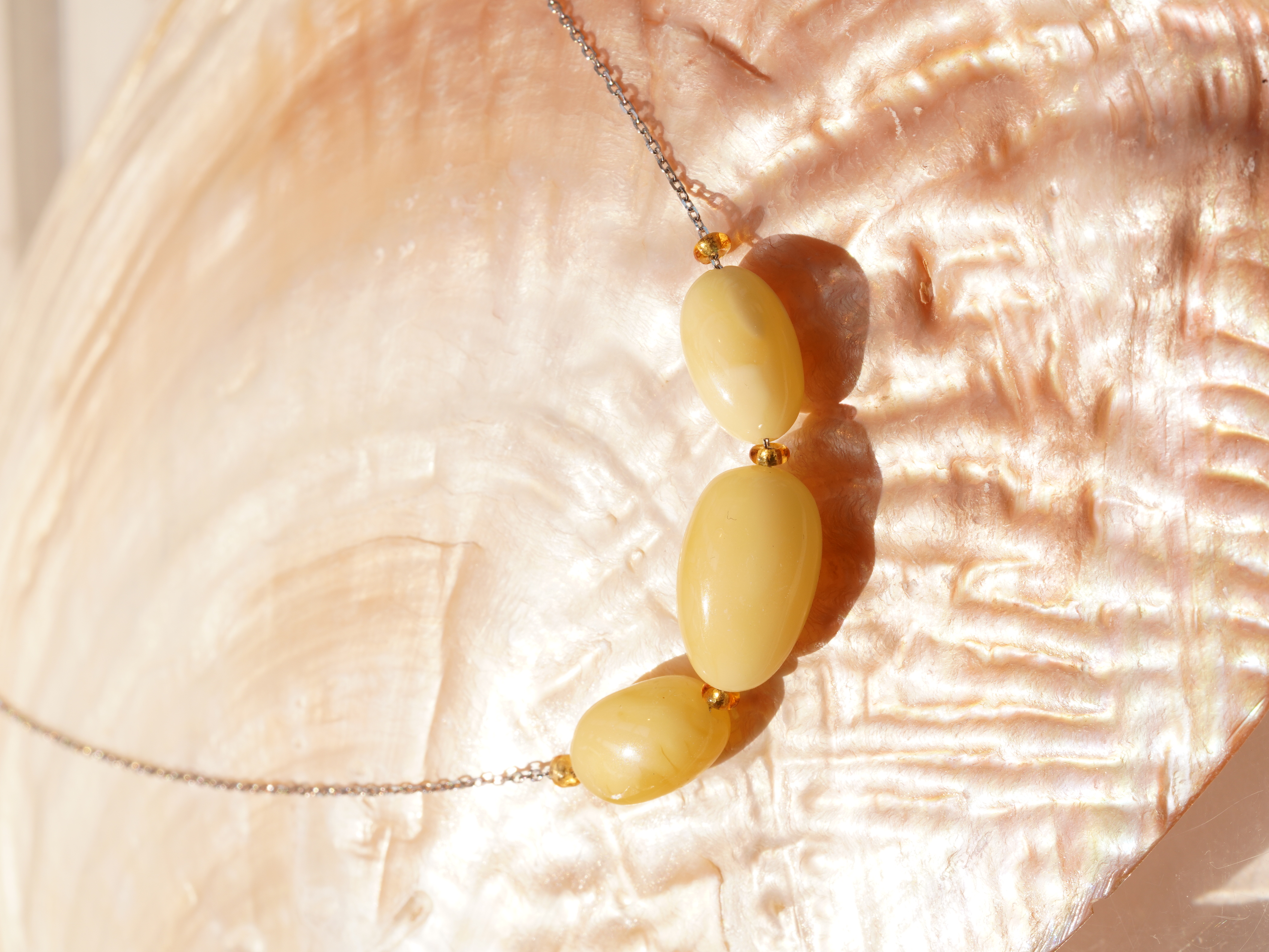 [A78][Amber 호박] 폴란드 밀화 트리플 조약돌 화이트 도금 925 실버 목걸이