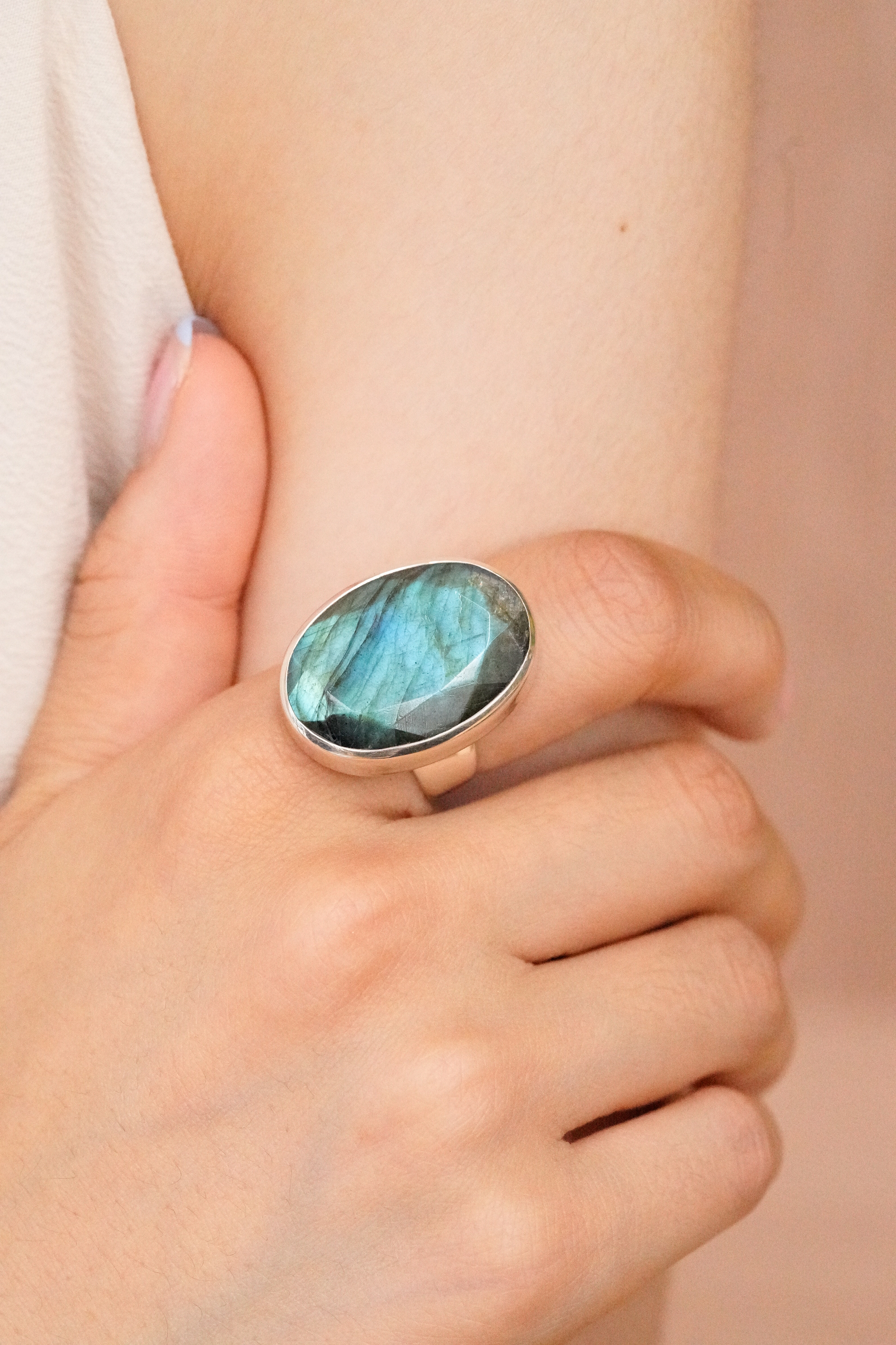 [658] [마지막한점] 블루빛이 매력적인 래브라도라이트 천연석 타원형 925 실버 반지 cm