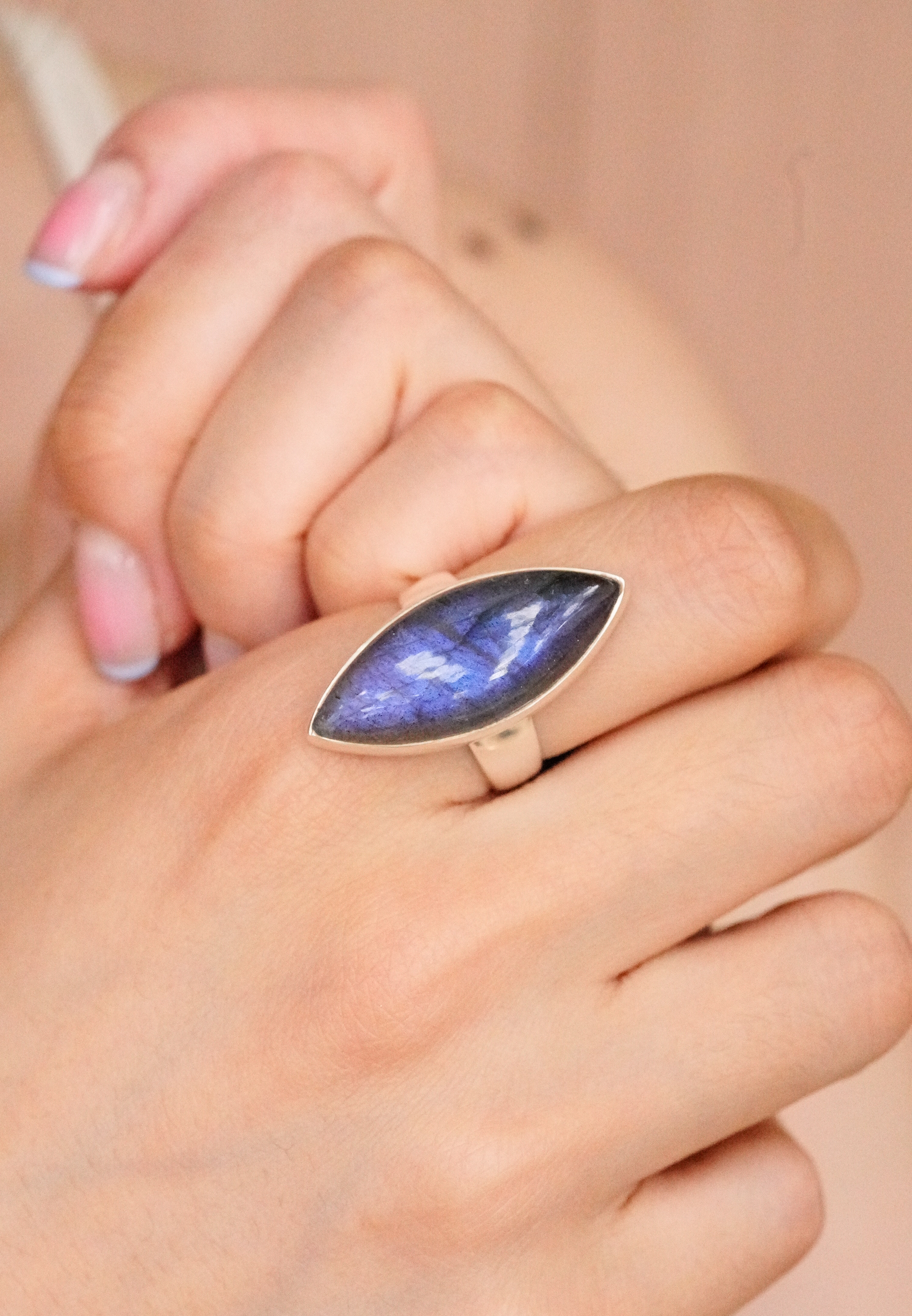 [654] [마지막한점] 블루빛이 매력적인 래브라도라이트 천연석 마퀴즈쉐입 925 실버 반지 1.4 x 3.2 cm