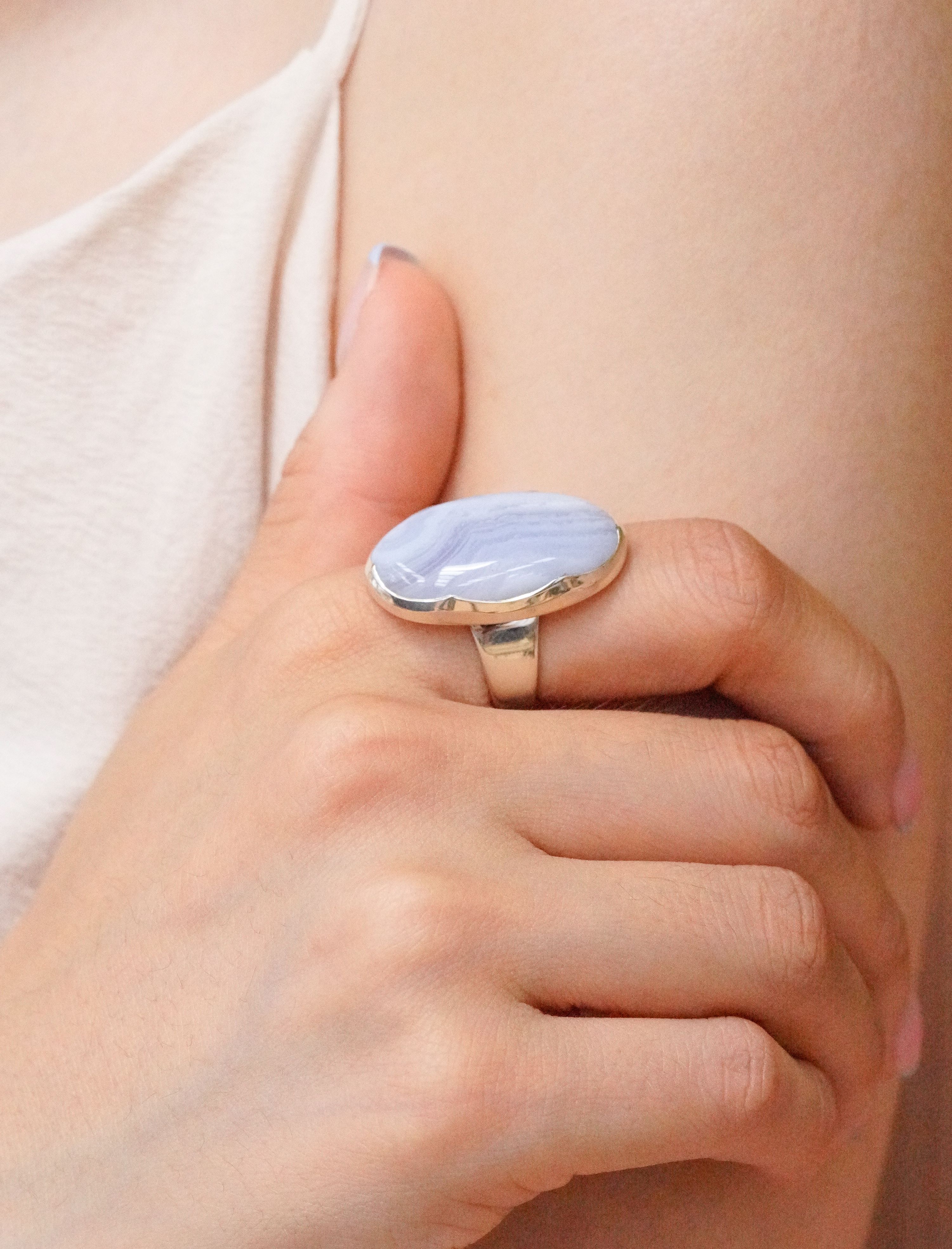 [519][원석포인트][마지막 한점]천연 블루레이스 아게이트 원석 925 실버 타원형 반지 1.76 x 2.9cm