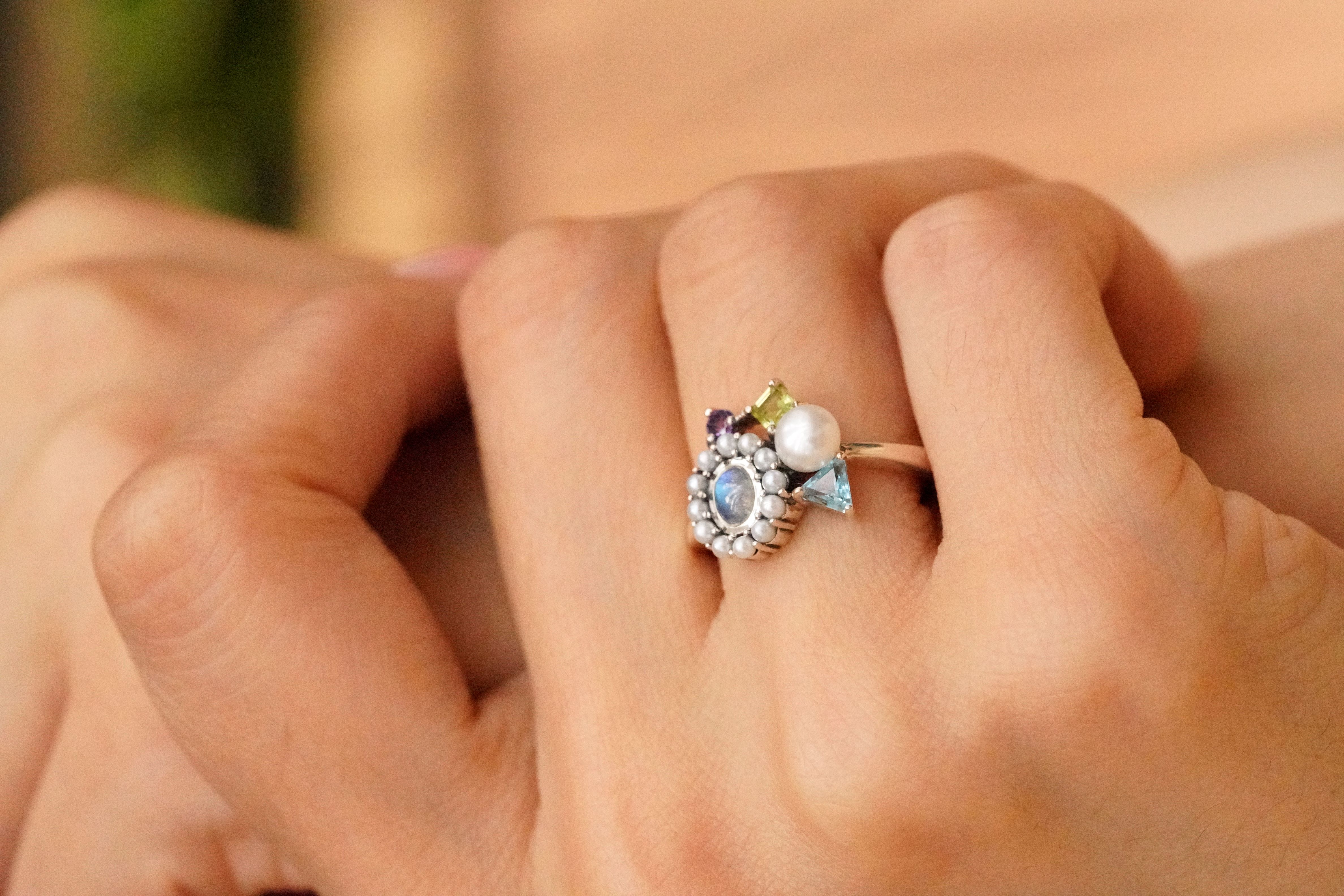 [398][Rokuzan] 로쿠잔 레인보우 문스톤 담수진주 페리도트 자수정 블루토파즈 원석이 꽃다발처럼 한데 모인 925 실버 원석 반지_약 19X 약14mm