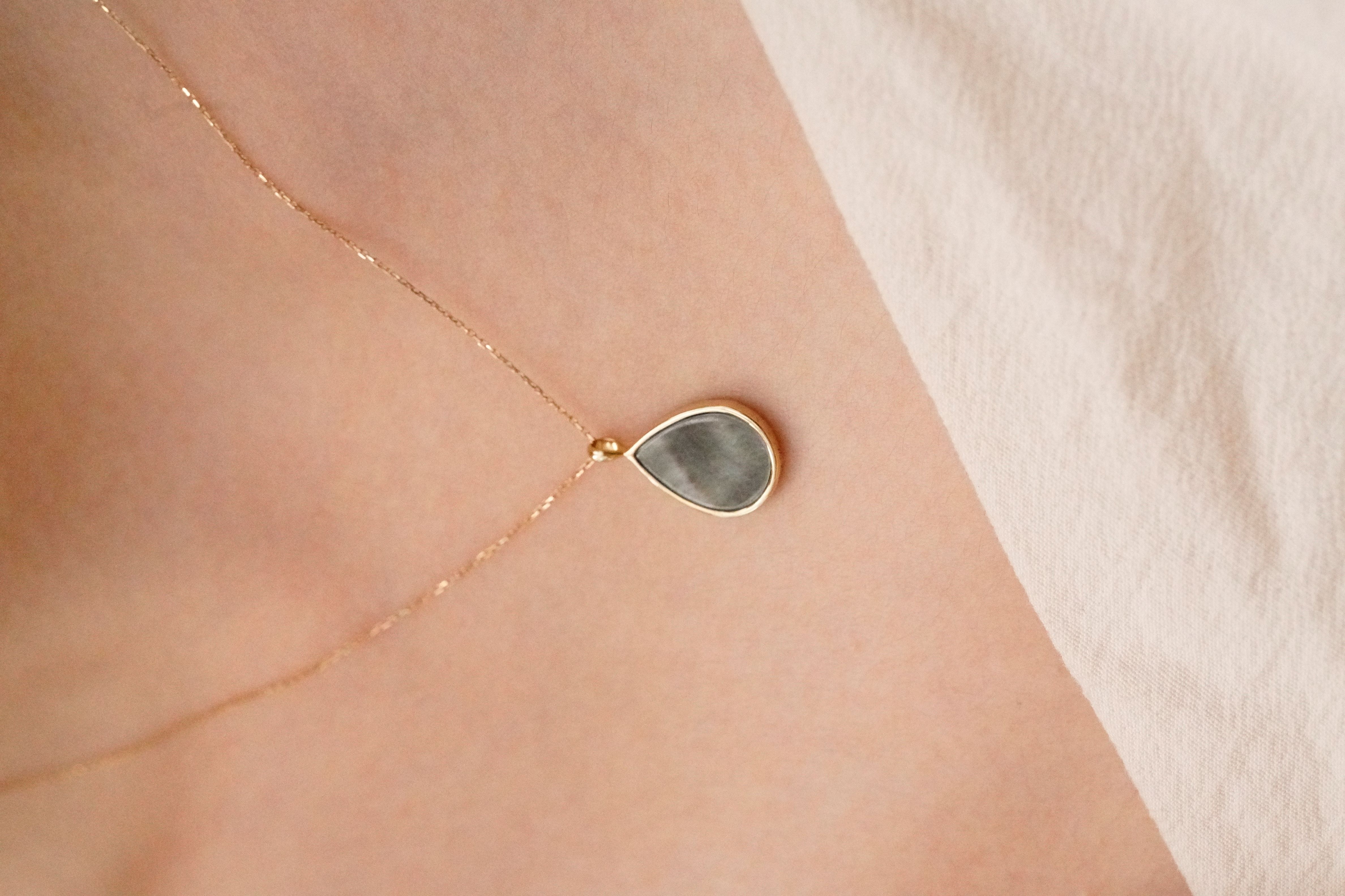 [426][Rokuzan]로쿠잔 10K 골드 검은 나비쉘 자개의 다채로운 색조와 물방울 쉐입에 아라베스크 무늬가 매력적인 양면 목걸이 40cm_36.5cm 영고리포함 약9.5x15