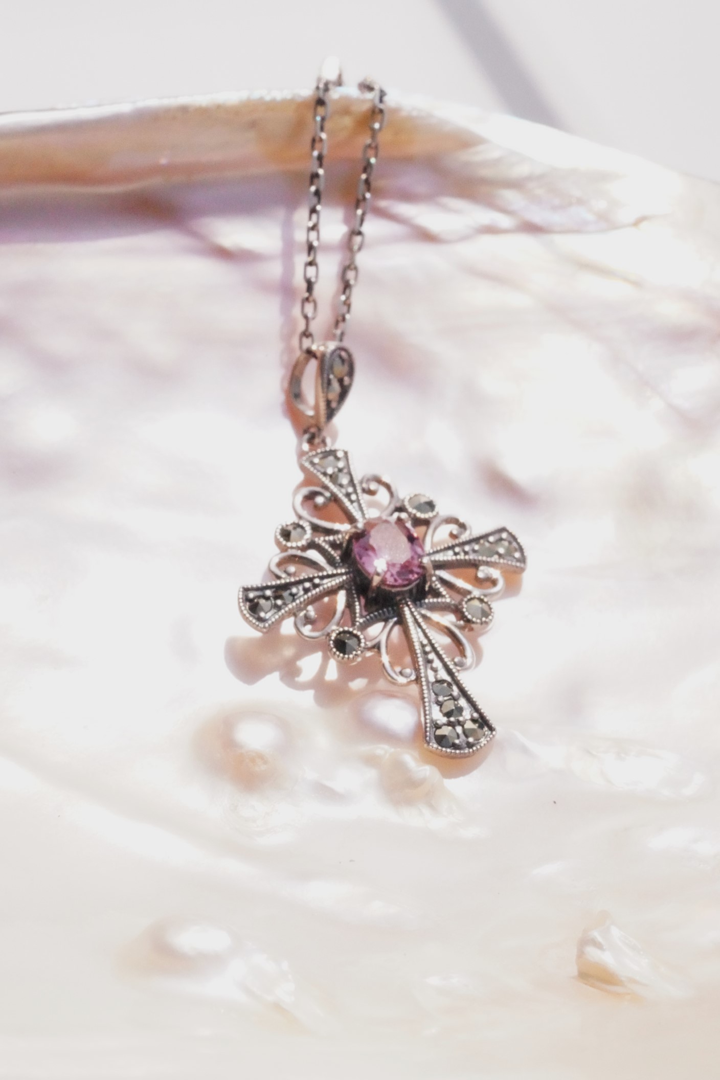 [396][마지막 한점][Rokuzan] 로쿠잔 투명도 높은 핑크 투어머린이 정중앙에 크로스 윤곽의 깔끔한 925 실버 원석 펜던트_약 16X23mm