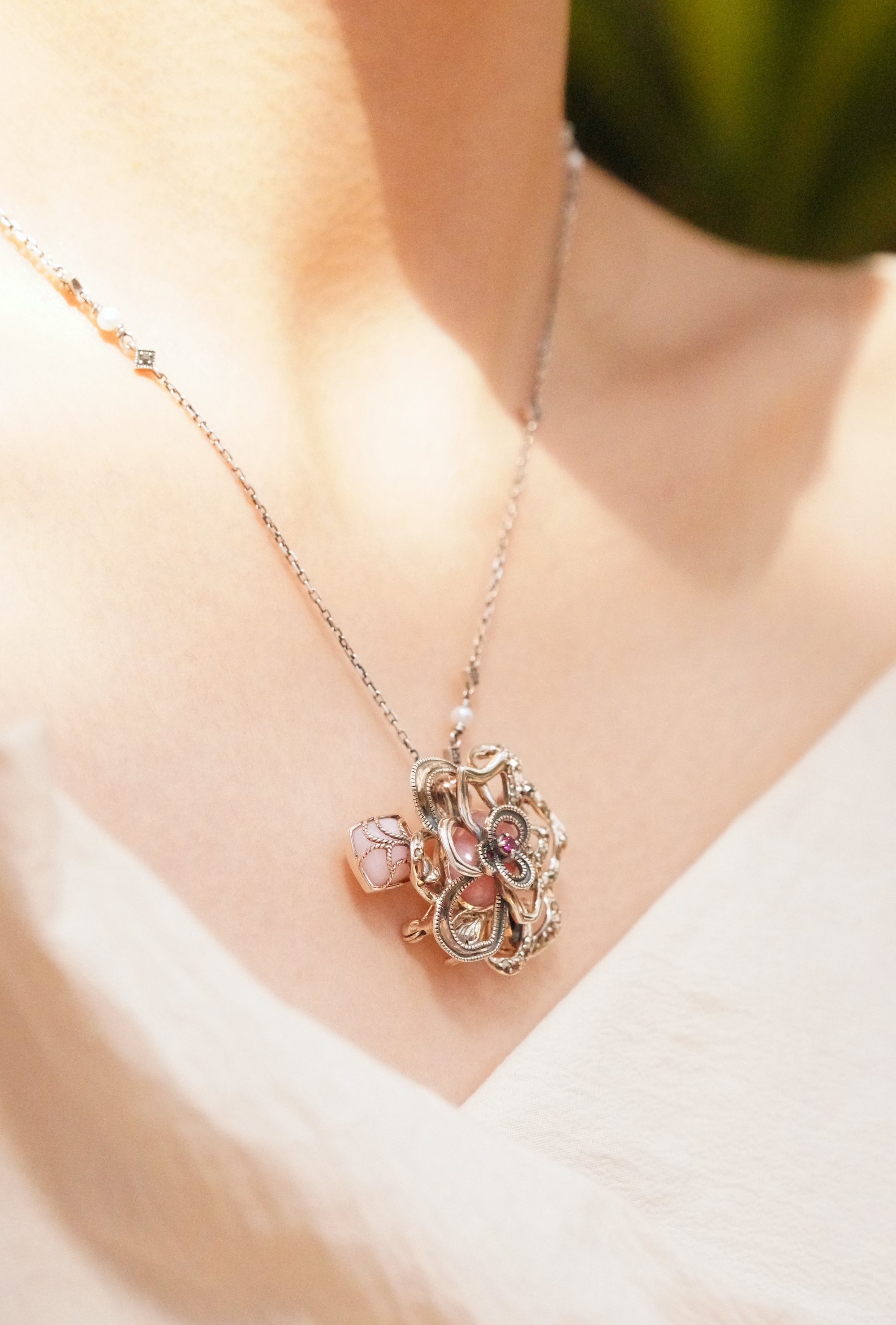 [363][Rokuzan][마지막 한점] 로쿠잔 핑크오팔 루비 로즈 925 실버 펜던트 겸 브롯지