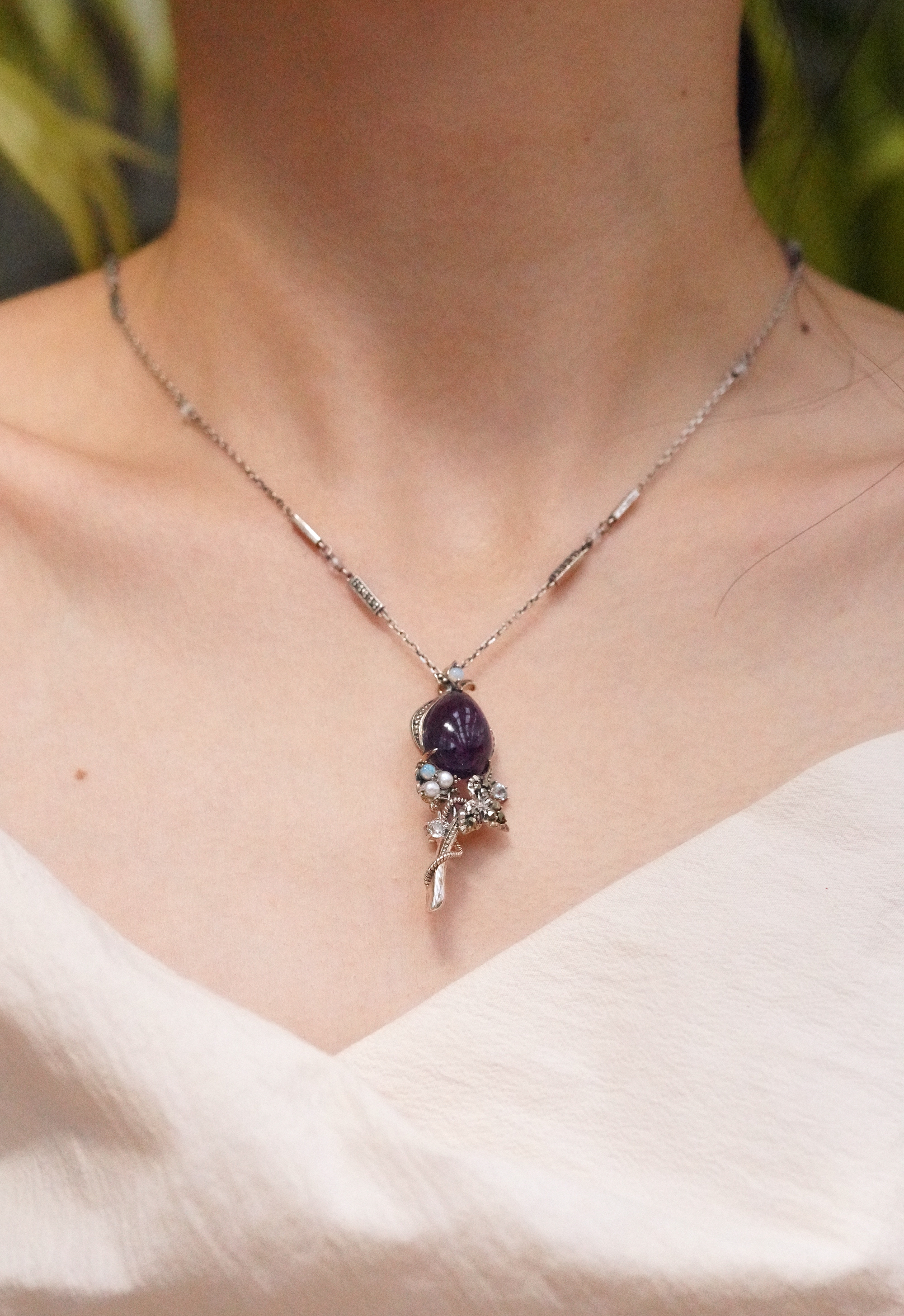 [356][Rokuzan] 로쿠잔 자수정 오팔 튤립꽃 925 실버 펜던트 겸 브롯지