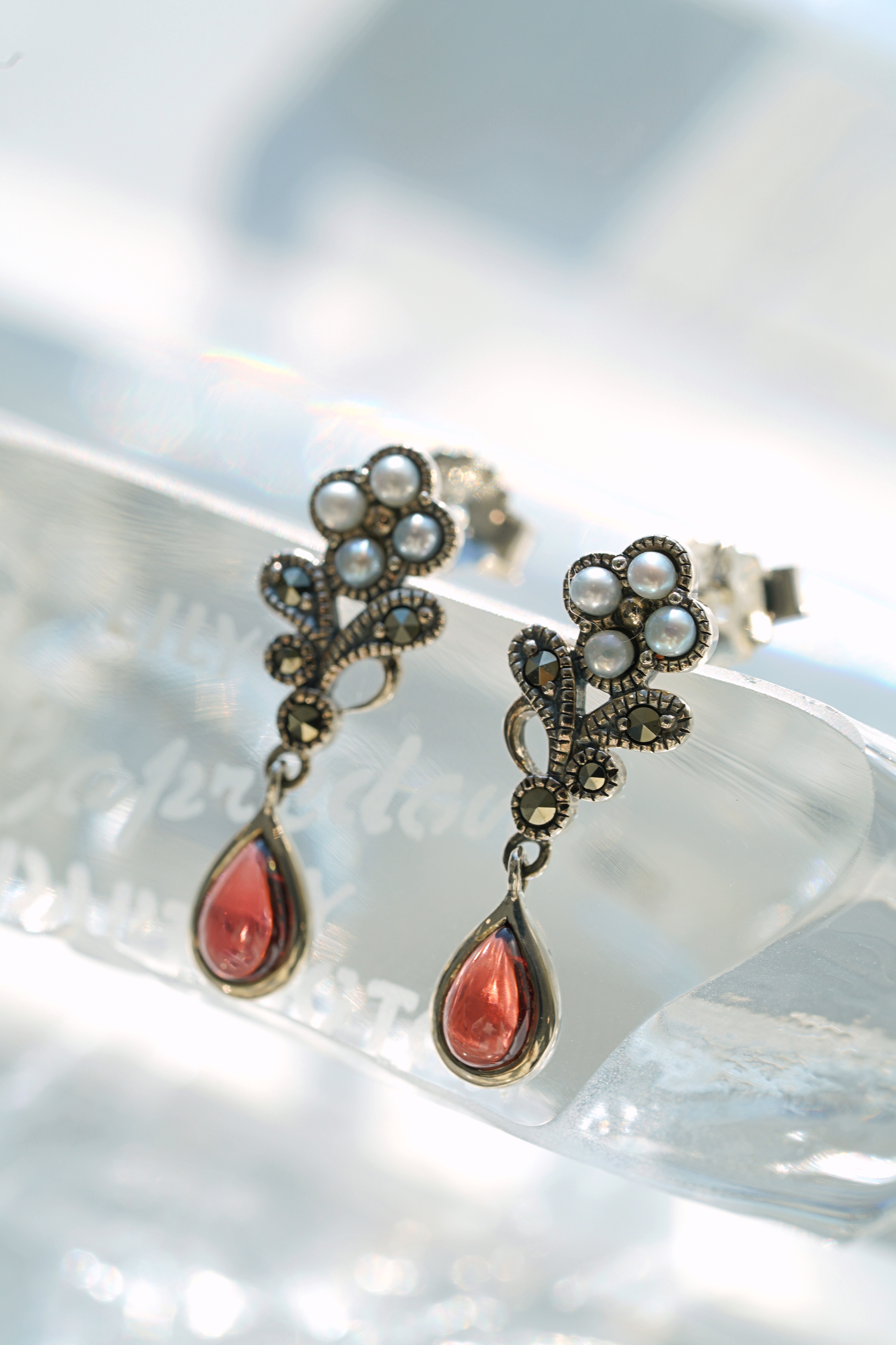 [194][Rokuzan] 로쿠잔 가넷 씨드펄 꽃 마카사이트 925 실버 귀걸이