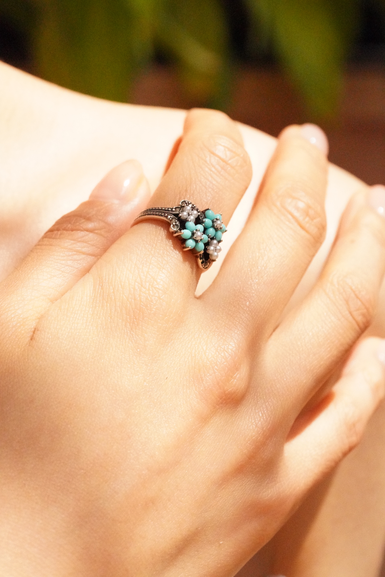 터키석과 씨드펄, 실버가 꽃을 만들어 낸 반지 입니다.