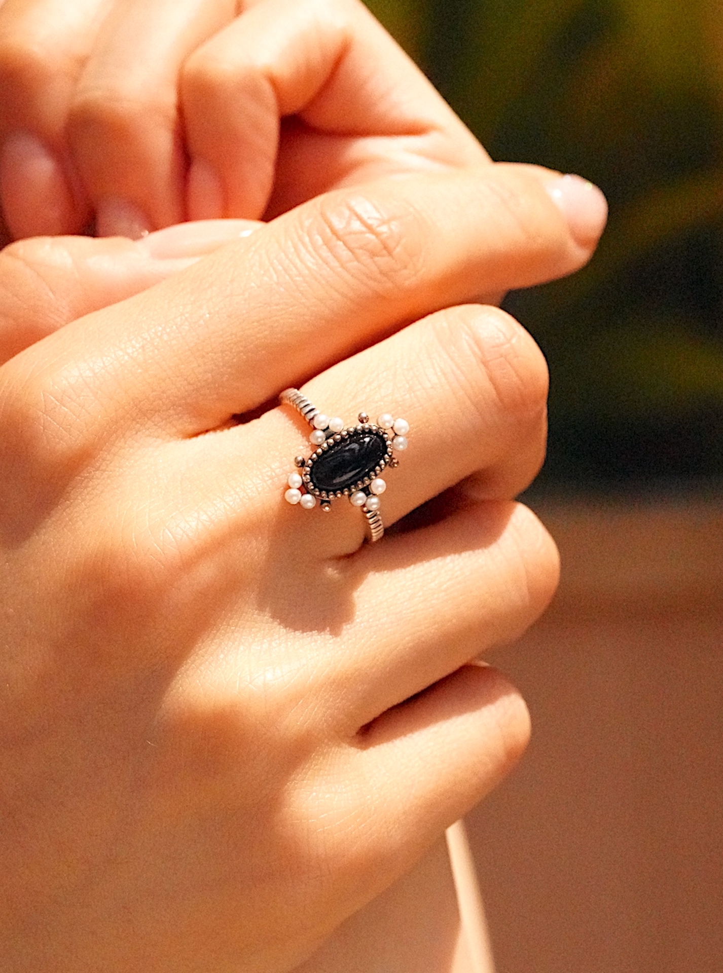 베즐 세팅 된 오닉스를 씨드펄이 그 주위를 감싸 우아하고 고급스러운 이미지를 보여주는 반지 입니다.
