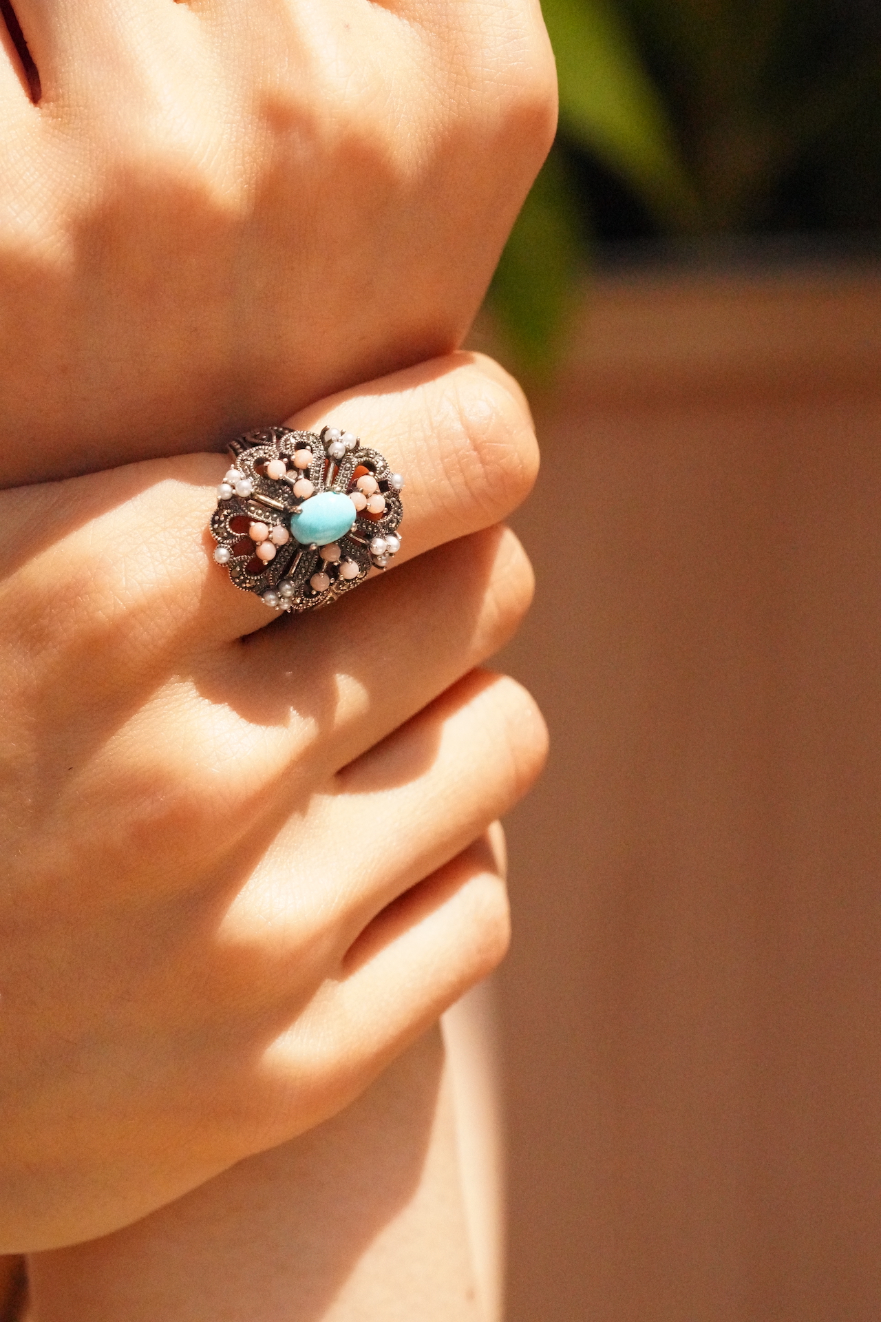 싱글 캐보션 컷팅의 터키석과 베즐 세팅된 산호석과 씨드펄이 마카사이트와 실버가 만나