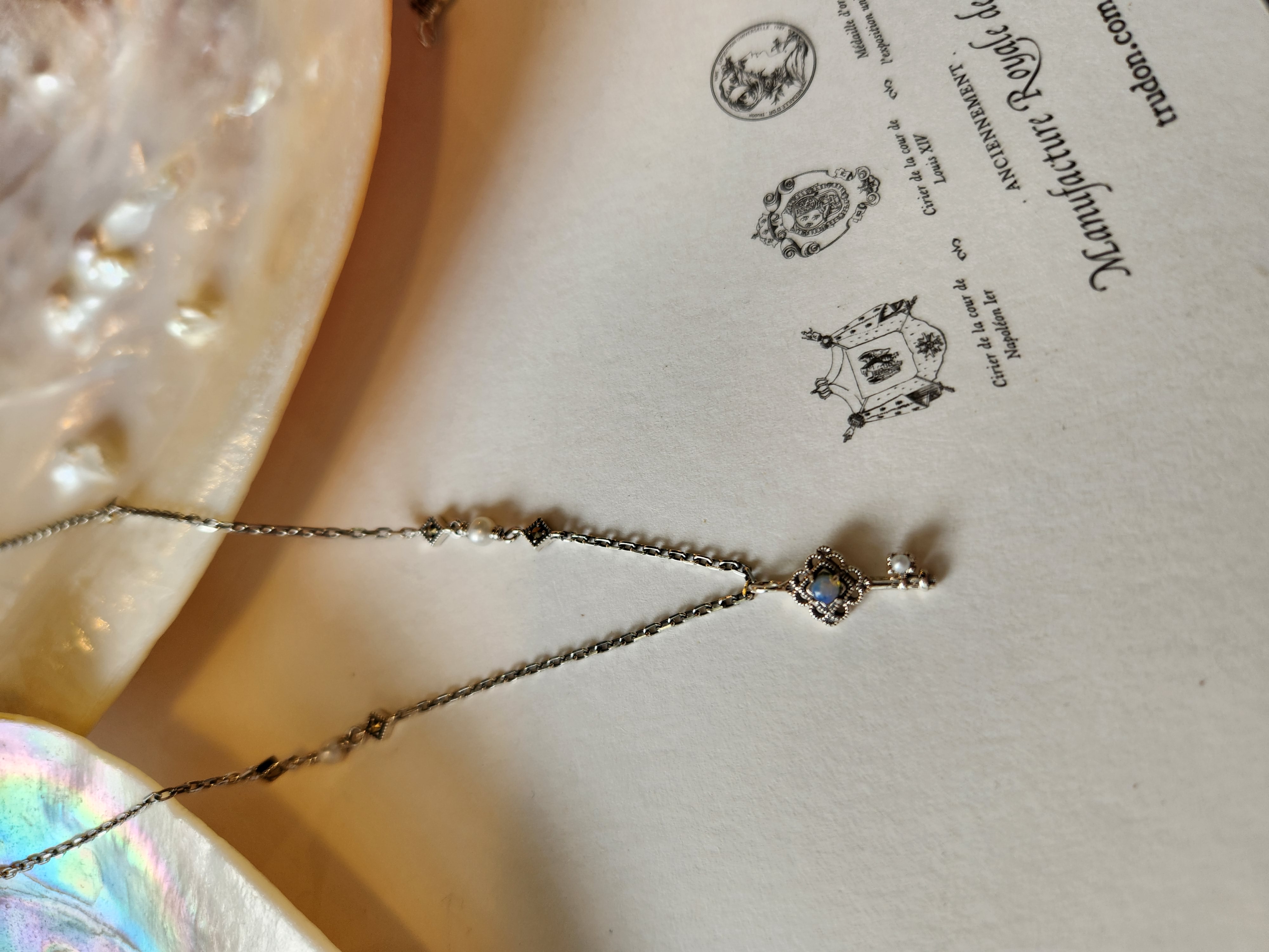 [0][Rokuzan] 로쿠잔 블루오팔 쁘띠 키 펜던트 + 마름모 마카사이트/천연담수진주 실버 체인 45/50cm 조합
