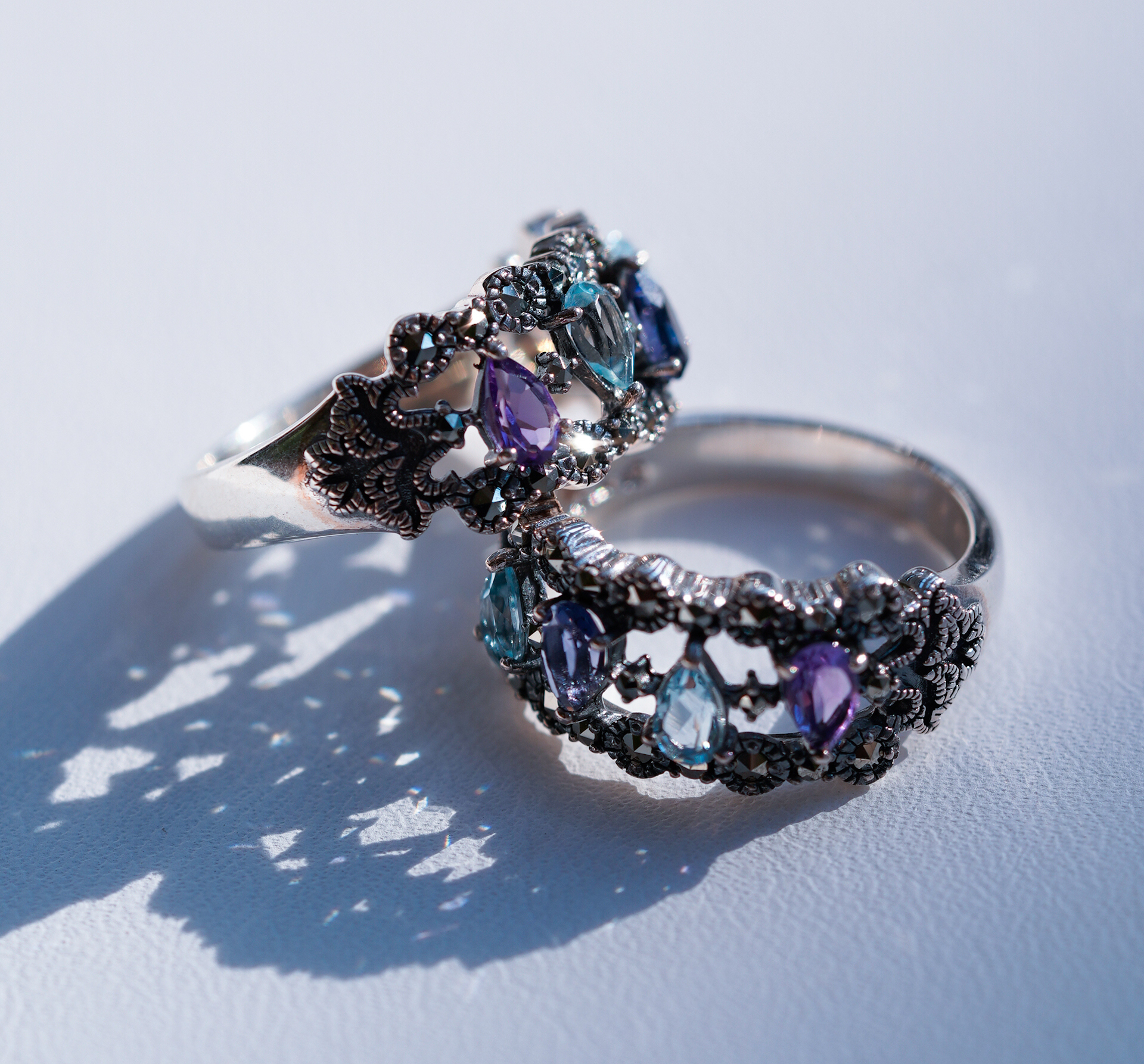 페어 컷의 아쿠아 마린과 자수정이 서로를 바라보듯 마주보며 정렬이 되어 있어