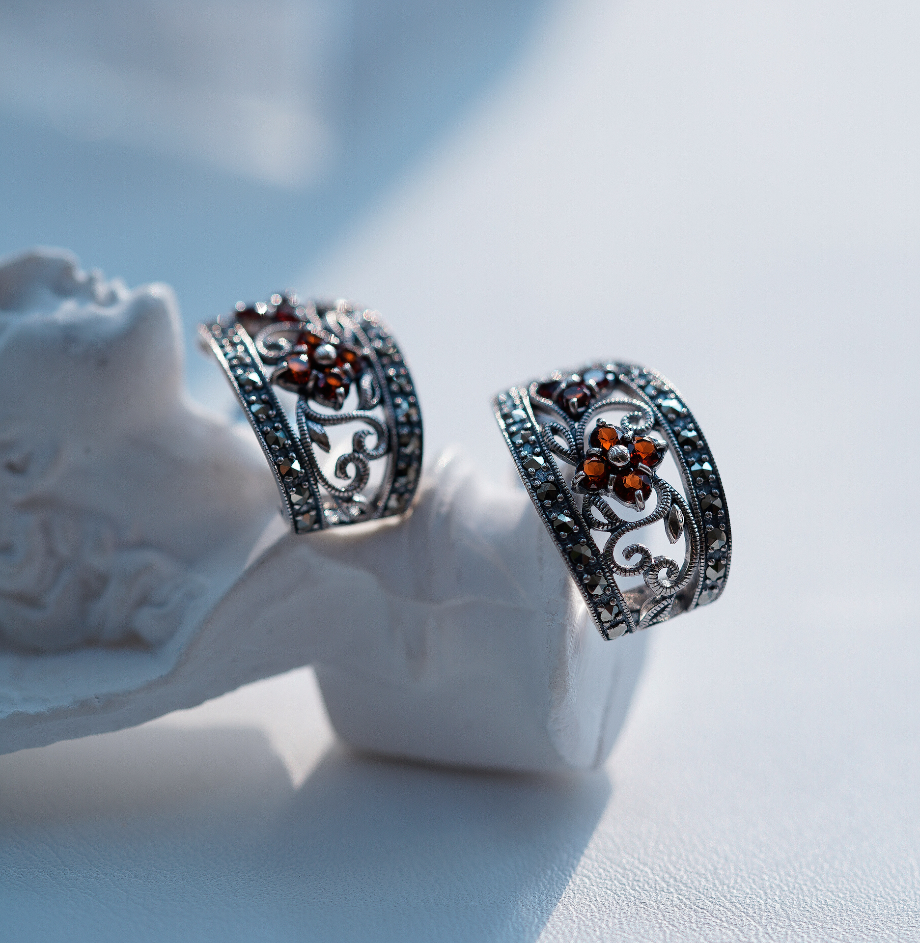 맑은 레드빛의 가넷과 925 실버가 한데 어우러져 꽃을 이루고