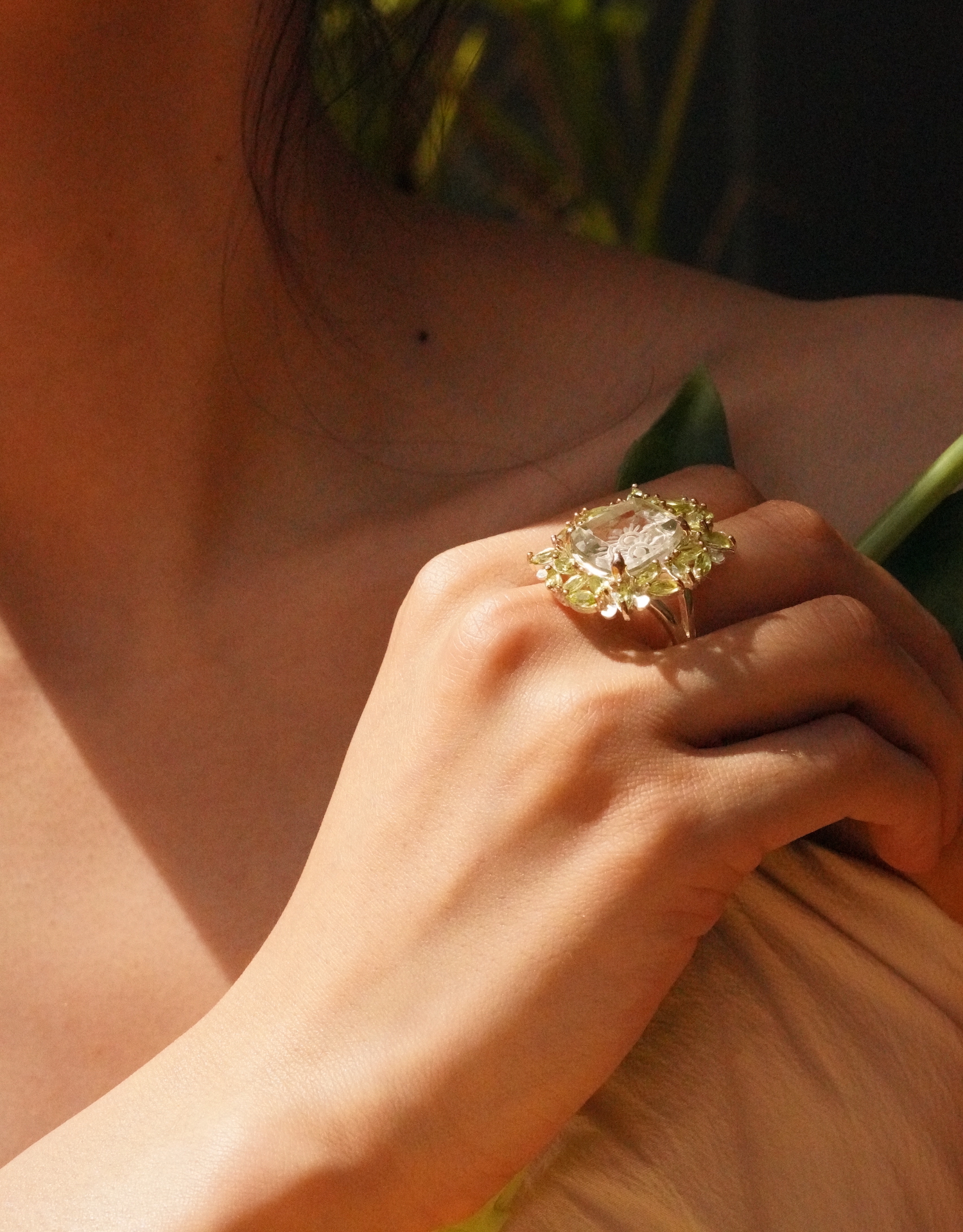파셋컷의 그린자수정과 마퀴즈 쉐입의 페리도트가 서로 이어지며 고혹적인 곡선을 만들어 냅니다.