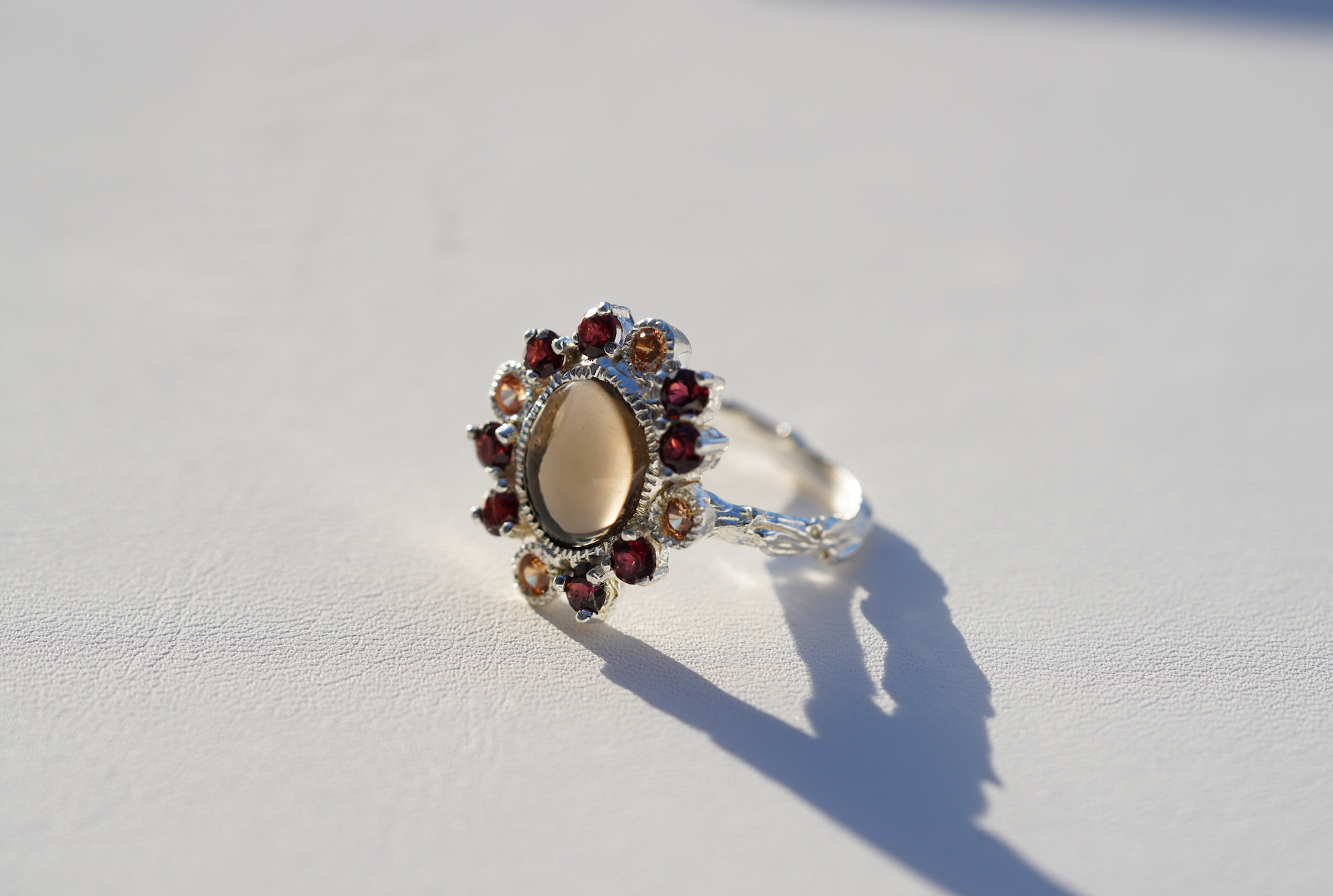 태양을 모티브로 재해석하여 가넷이 싱글 캐보션 컷팅 된 스모키 쿼츠를 감싸고 있는 형태로