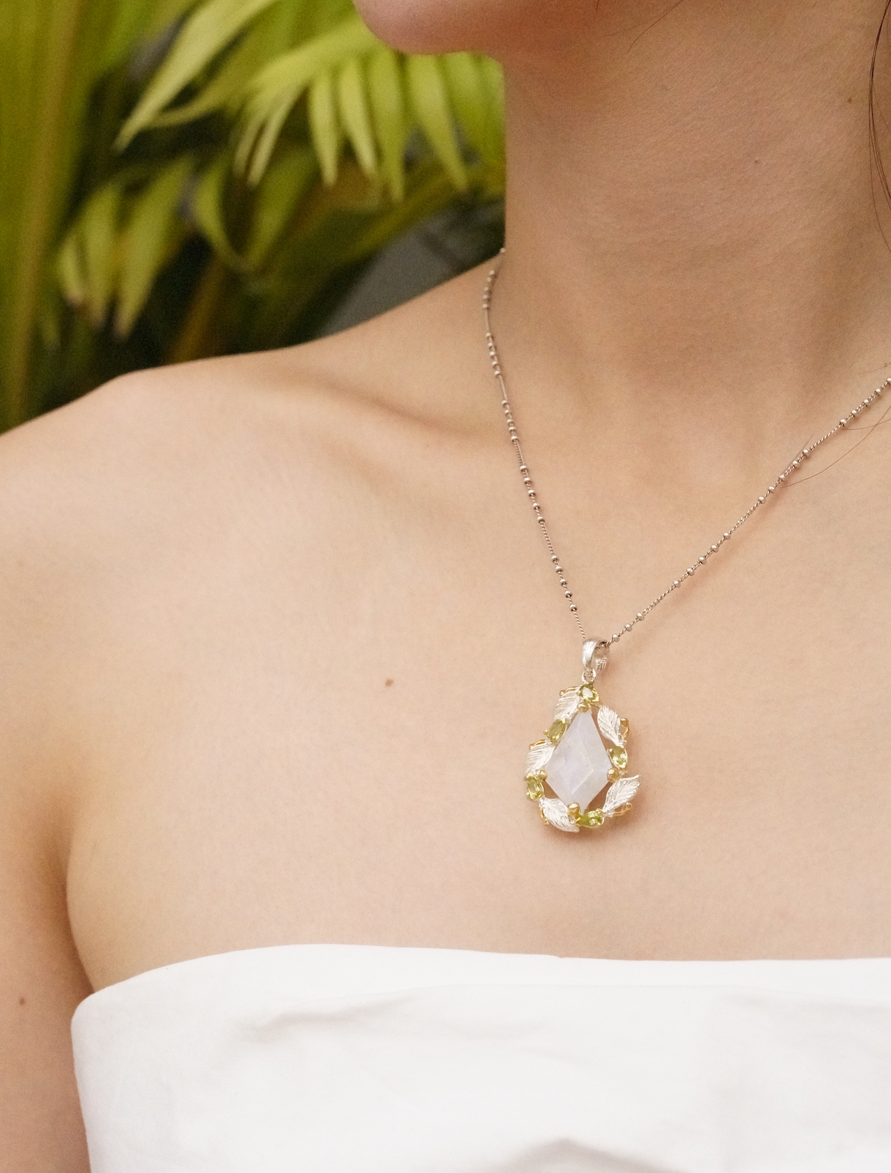 나뭇잎 모티브를 재해석하여 표현한 실버와 페리도트, 파셋 컷팅된 문스톤과 아름답게 어우러져