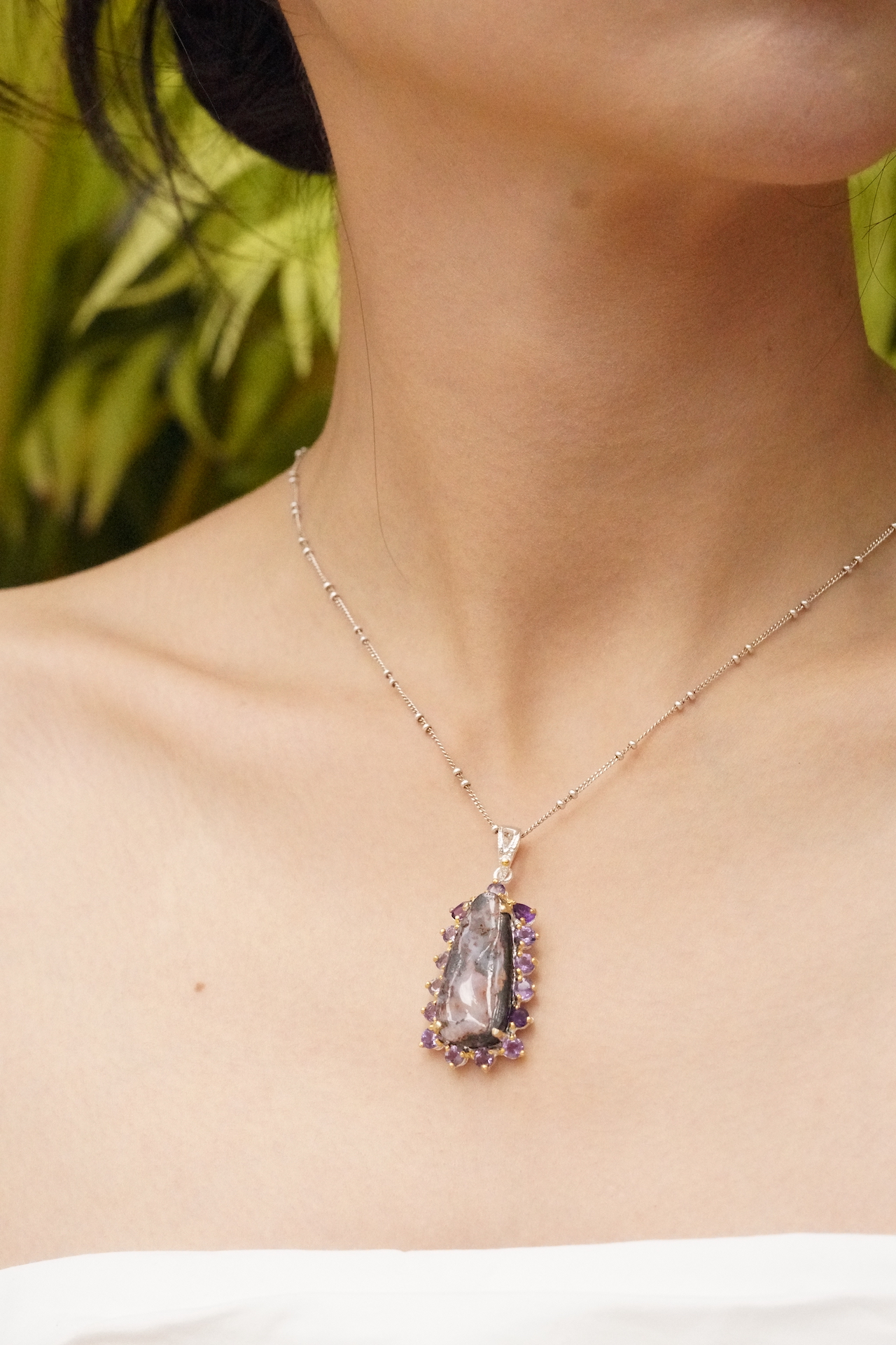 피셋 컷팅을 통해 내면의 아름다움을 나타냅니다. 베즐 세팅 된 자수정이 보우더 오팔의 존재감을 더해줍니다.