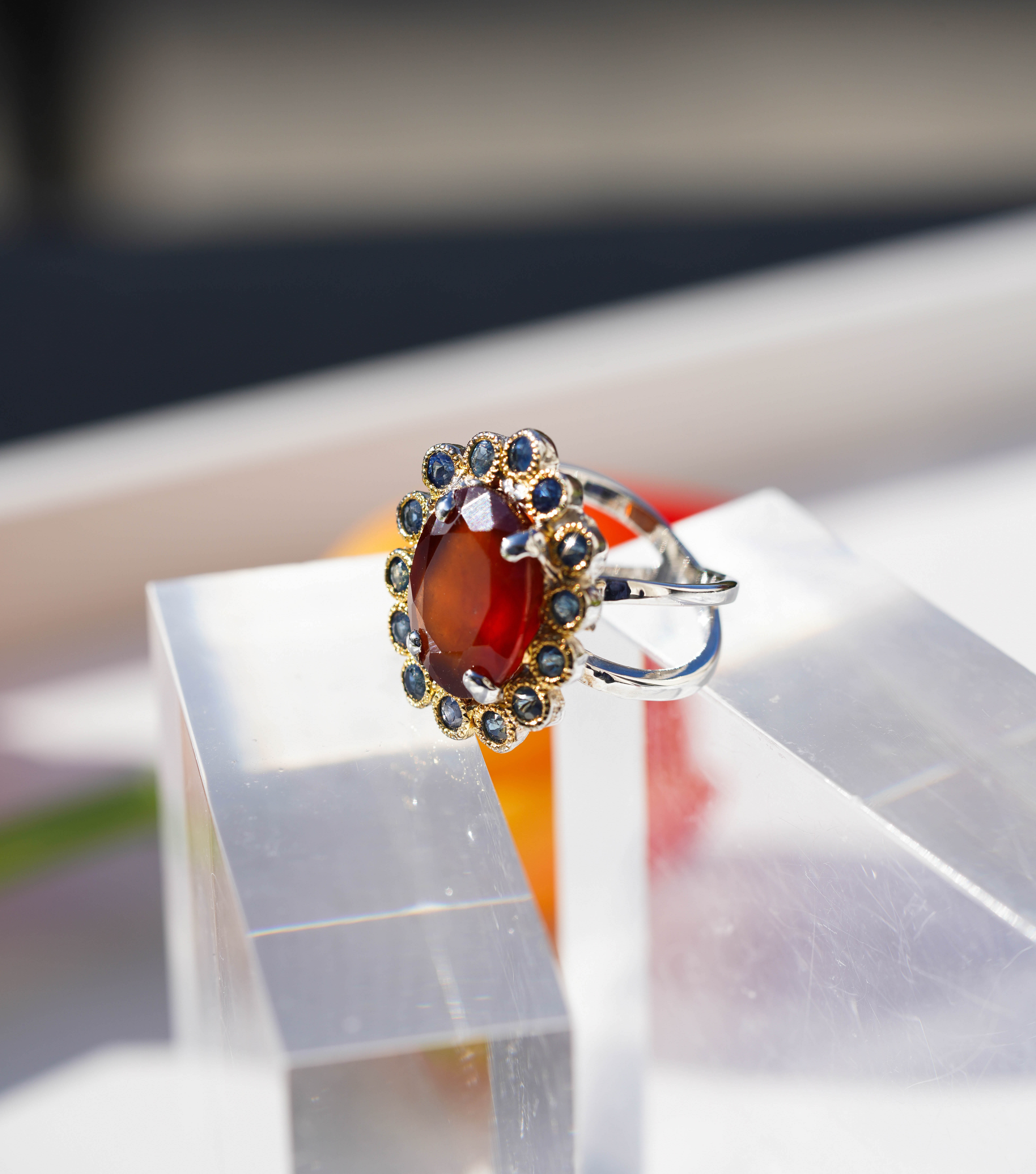 브릴리언트 컷팅된 헤소나이트 가넷을 베즐세팅 된 로돌라이트 가넷이 그 주위를 감싸 하나의 꽃을 이룬 반지 입니다.