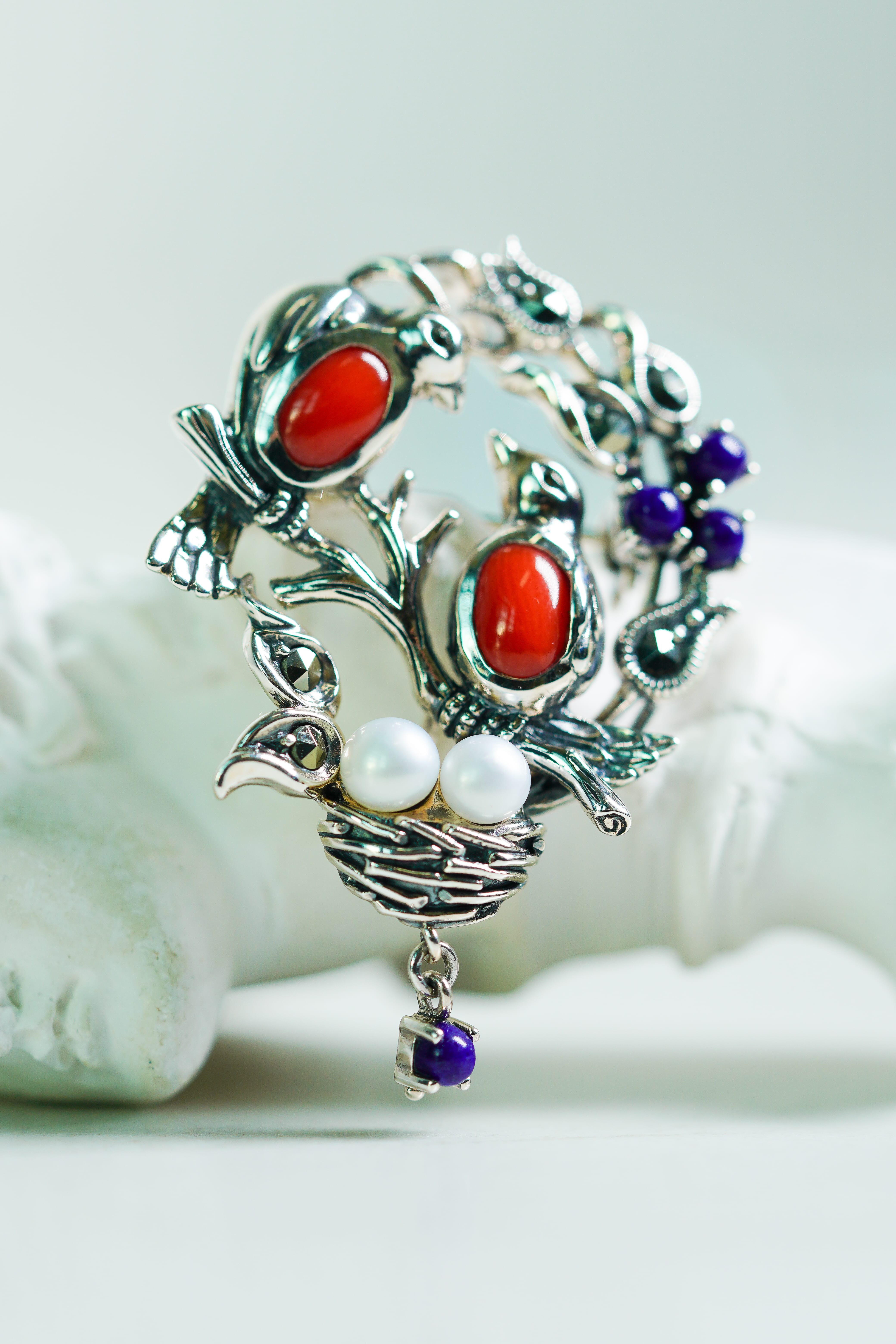 [26A414][last] 진주를 품은 산호 새 팬던트 및 브로치