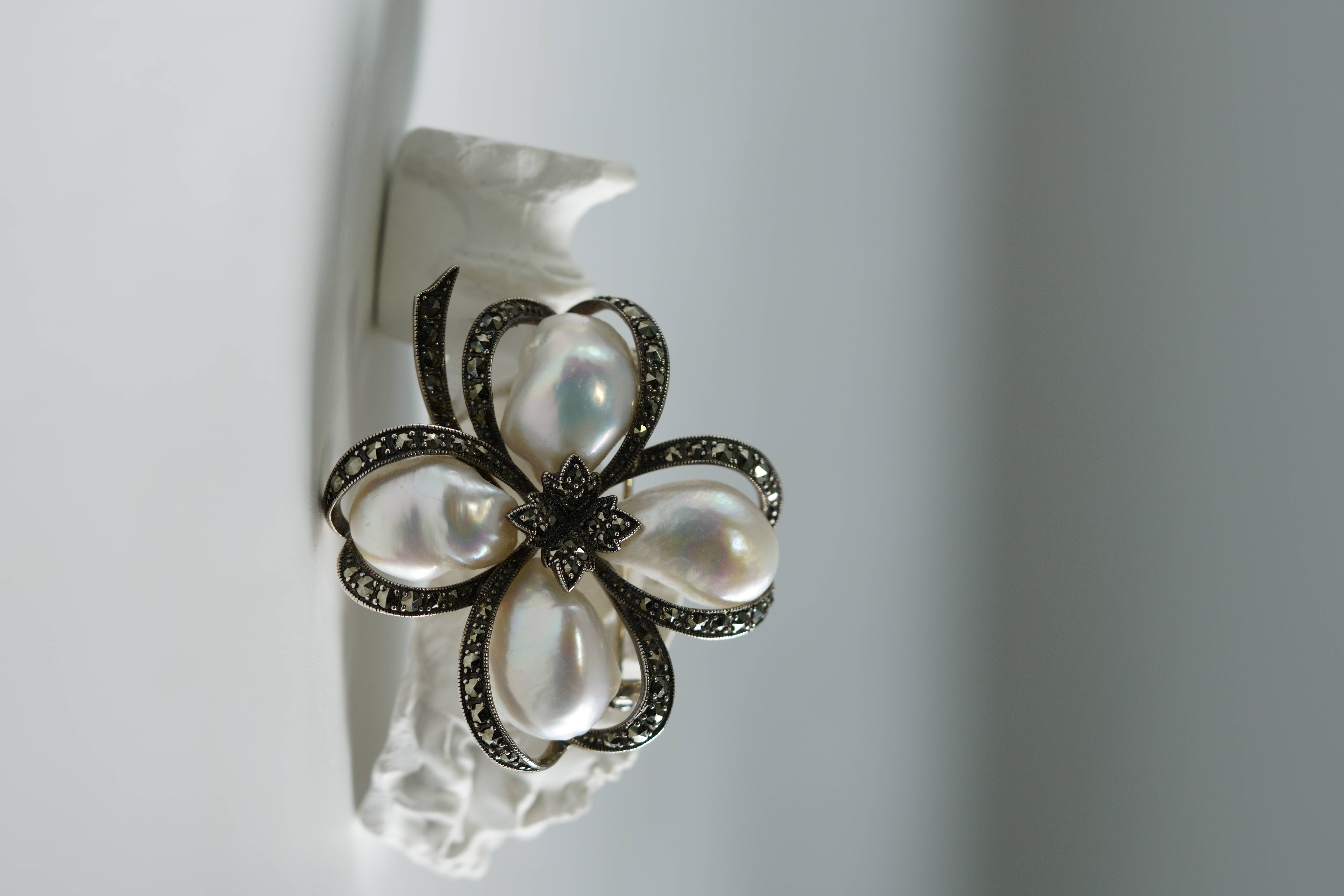 [26A89] 로쿠잔 네잎크로버 천연 담수진주 실버 브로치 겸 펜던트