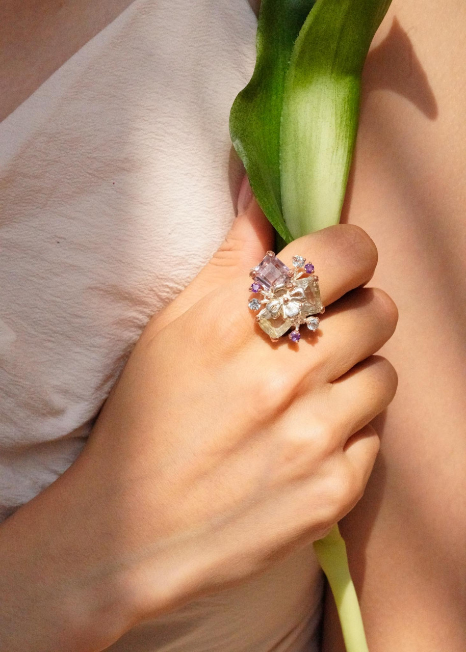 [436N]마지막 한점][디자이너] 솜사탕같은 색감의 자수정 시트린 그린자수정 원석 925 실버 반지