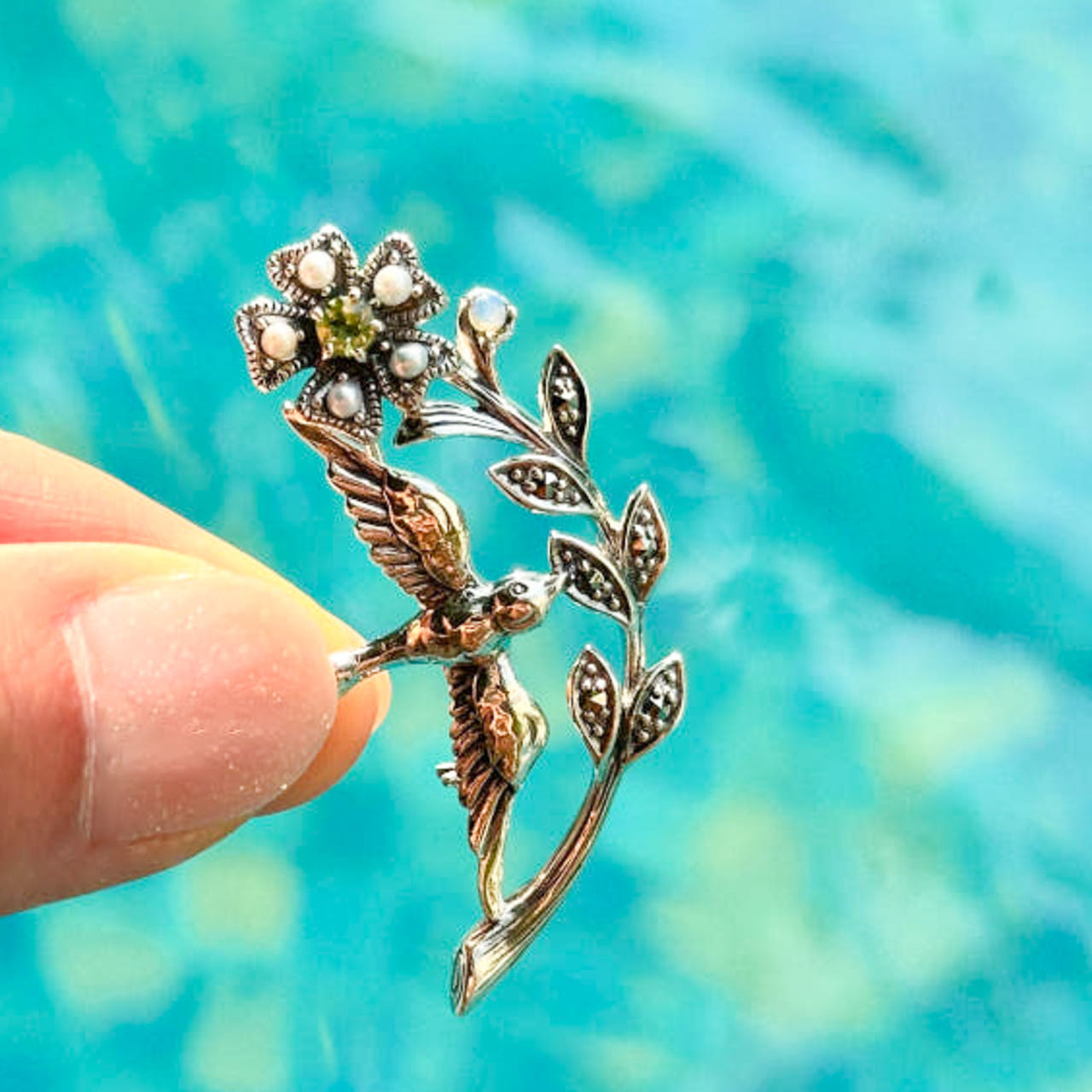 [R179][Rokuzan] 로쿠잔 천연 페리도트 블루오팔 꽃을 물고 좋은 소식 들고 오는 새 브로치 펜던트 겸 925 실버