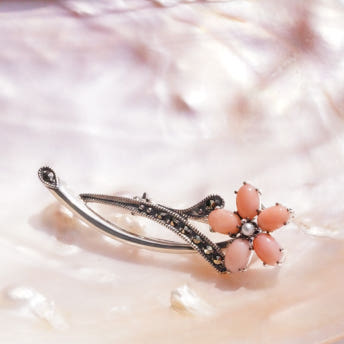 [400][Rokuzan] 로쿠잔 부드러운 핑크색감의 산호에 꽃 줄기 마카사이트 펜던트 겸용 브로치 원석 925 실버_약 45X15mm
