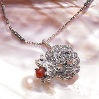 [397][마지막 한점][Rokuzan] 촉기있는 가넷 눈동자에 야무지게 커널리엔 도토리를 소중히 안고 있는 귀욤터지는 925 실버 펜던트 브롯지 겸용_약 20X 약 25mm