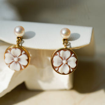 [C100][마지막한점]18K 골드 아코야진주 입체적인 플라워 사도닉스 쉘 까메오 귀걸이 아코야진주만 착용가능 11x18mm